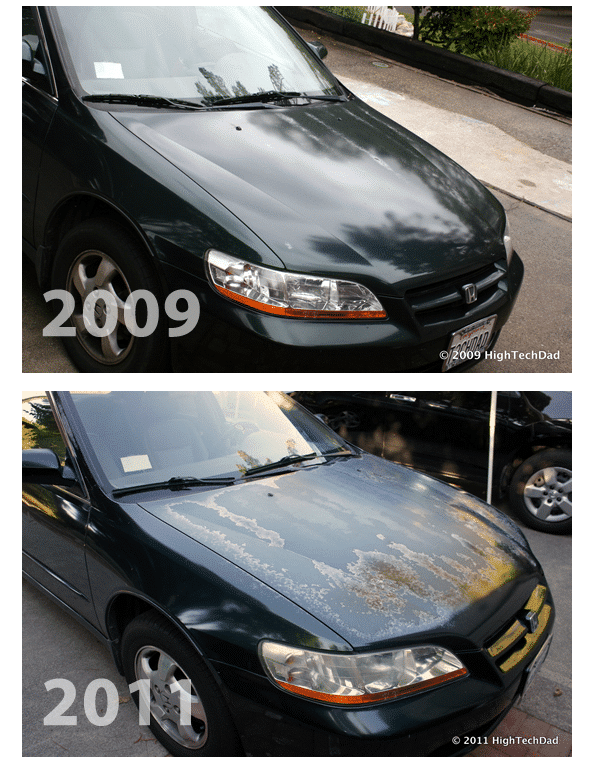 So, what am I talking about here? Take a look at the picture below…that is my Honda Accord in 2009 on the left and its current state now in 2011 (throughout this article, you will see pictures illustrating how much of the clear coat has eroded away on my 1998 dark green Honda Accord).