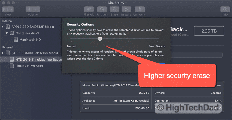 So, using Disk Utility, I selected the Time Machine hard drive and chose “Erase.” I did a quick format.