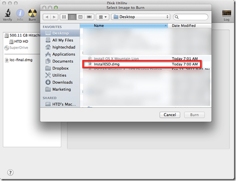 When you click on the “Burn” icon, you will be asked which image you would like to burn. Navigate to where you saved the “InstallESD.dmg” file and select that.