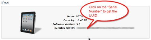 Normally, it is quite easy to get the UDID/UUID of your iOS device. Simply connect your iPad or iPhone to iTunes and then look at the Summary screen when your device is selected within iTunes. You will, by default, see the Serial Number.