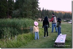 The next day, the bull frog race was one of the highlights of the week for my kids. It was really a fun event. The children were broken up into several heats of about 6 “racers.” They chose the frogs they wanted (I mistakenly thought that it would be a good idea for my daughters to choose smaller ones so my youngest got a tiny frog and middle daughter chose a medium sized one – my oldest did not race as she had met some other girls at the ranch and had become friends and they were watching from afar in their little clique). Prior to the race, people could bid on the frogs. You essentially got an owner and a racer. The owner was typically the parent or grandparent and there was a bidding process for each frog. Frogs were typically bought/sponsored for about $30-40. All of the money would go to the winners (and losers) of the race. Everybody won in the end (racer & owner) but some owners actually made money from the races. We, alas, did not. The race was really fun actually. The kids could not push the frogs but could slap the ground next to them or “kiss” them (yes, both of my daughters did manage to kiss their frog’s butts a few times – which actually made the frogs jump). The race started on the lawn and the finish line was the pond. The frogs raced down hill and crossing the finish line meant they leapt into the pond to freedom.