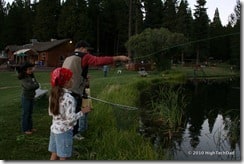 But if you want to take a break from riding, there are two stocked ponds where you can fish. Since I had injured my head the week prior and the doctor had said that I couldn’t do any riding (I was really sad about that), I did try fly fishing in the ponds a bit. The pond closest to the lodge had lots of “hungry” little fish which kids (and I caught) fairly easily. The lower pond had some really big “lunkers” that were a bit smarter and really fat. I was able to hook an 18″ rainbow trout there. While they encourage catch and release, if you do catch a really big trout, you can keep it and they will cook it for you for dinner.