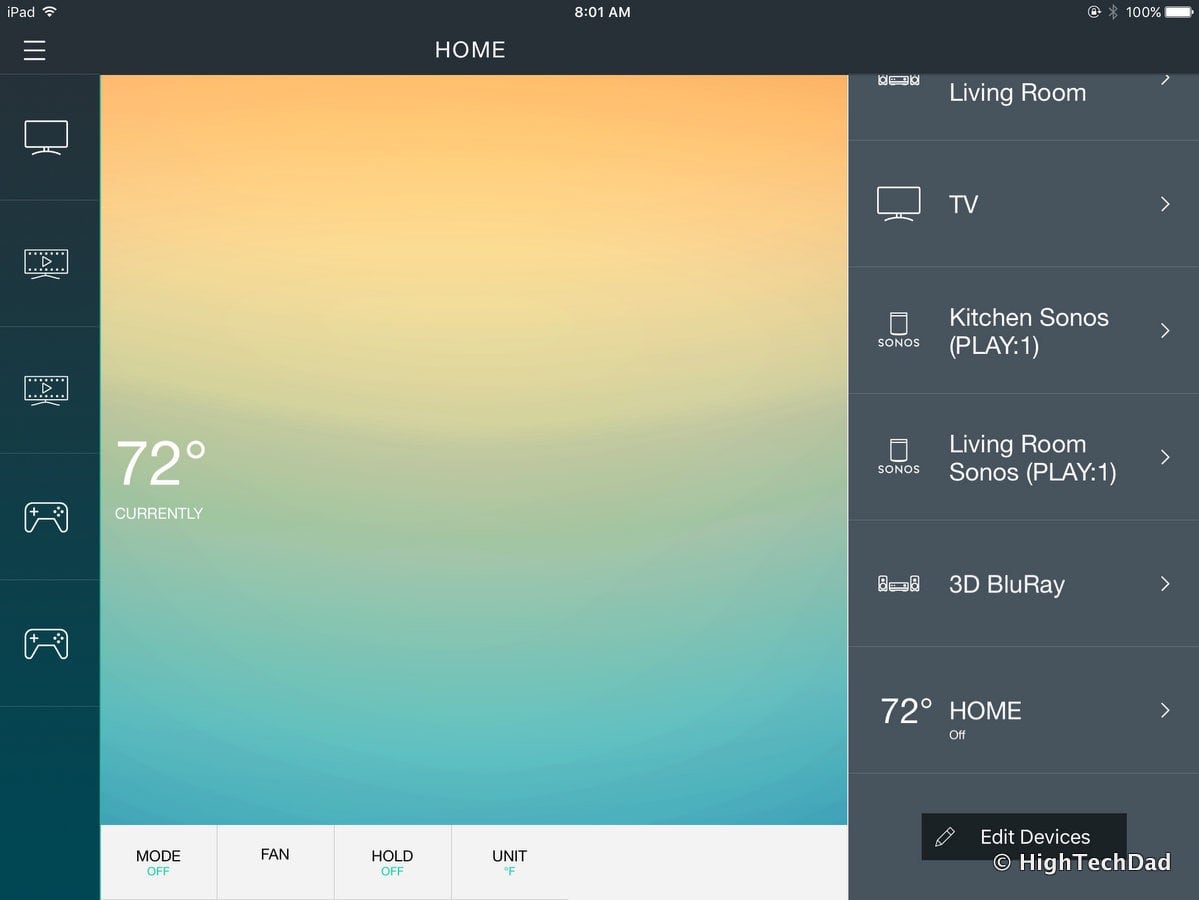 As a nice little bonus, it shows the current temperature as pulled from the thermostat. One thing to note, in this particular case with this specific device, the “activity” of controlling the thermostat can only be done within the Harmony app and not on the remote. (The Sonos commands described earlier in the article DO appear on the physical remote screen – it depends on the device and the activity.)