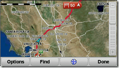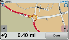 Using the TomTom Home application, the “Operate My Device” function is quite helpful, in fact, it allows me to show you some highlights of how the GPS works as well as get used to the UI. The screenshots below are from the actual trip that we took to the Dude Ranch. Using the desktop software and controlling my GPS, I ran our trip in “Simulator Mode” so that I could see a demo run of my route. While you don’t normally need to do this type of thing, because the voice prompts and screen navigation is normally quite sufficient to just head out the door without any pre-planning, it is nice to use the demo mode for screenshots or view the trip.