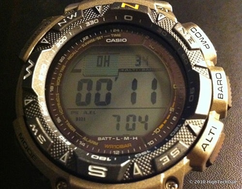 The Compass feature is pretty nice as well, but requires a bit of reading in the manual (or being a boy scout) to know how to navigate using it. Clicking another dedicated button activates the digital compass and as you move around it points to North and gives you a degree reading based off of 0 degrees north. You can also spin the N-S-E-W dial on the face of the watch to help you with navigation and tracking directions.