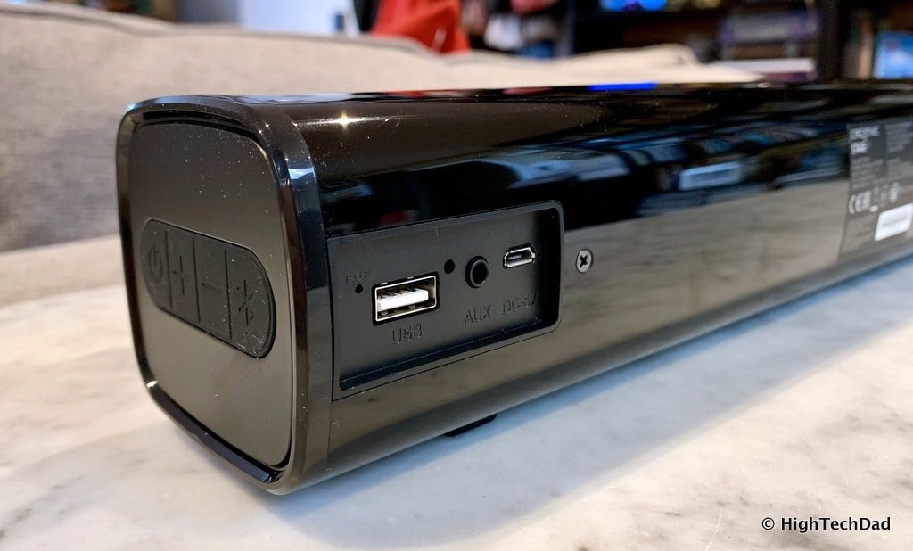 On the backside are the various ports. There is a micro-USB used for charging up the internal battery, a 3.5mm AUX-in port so that you can connect non-Bluetooth audio devices, and a USB port. Contrary to what you might think, you cannot use the USB port to connect to a device like a laptop. Instead though, you can plug in a USB mass storage device (like a thumb drive) and use the Creative Stage Air as a stand-alone music playback device. For most playback, however, I would recommend using Bluetooth.