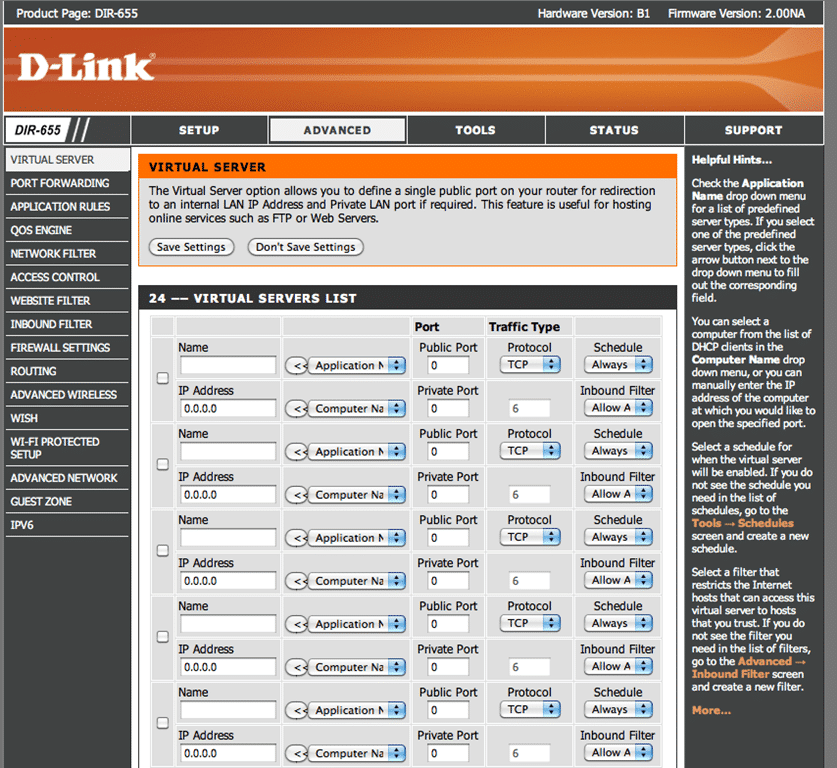 - Virtual Server – configure single public port for redirection (e.g., web or FTP server)