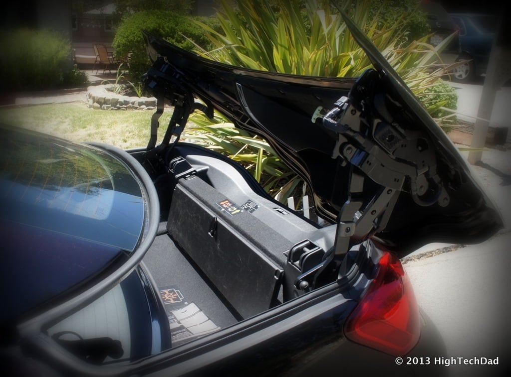 There is a little flap that you need to have up and in place before opening the top. You can see it in the picture above. But once you put the top down, your trunk space is dramatically reduced to about 2 cubic feet. That’s not much! The video shows about how much space we are talking about.