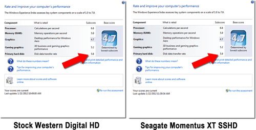 Here are the side by side test results for the Windows Experience tests. The stock Western Digital drive is on the left and the new Seagate Momentus XT drive results are on the right. As you can see, the overall score didn’t change (because it uses the lowest score as its overall score), but the disk transfer rate increased by 0.1 points.