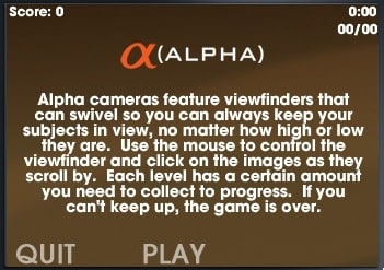 The game is broken down into showcasing 3 different products lines: Handycam, Cyber-Shot and Alpha. Main screen is below.