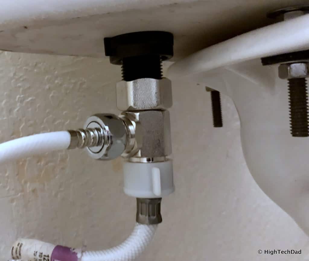 Next, you connect the T-valve to the toilet tank. This essentially splits the incoming water from your water supply to the Omigo and to the toilet tank itself.