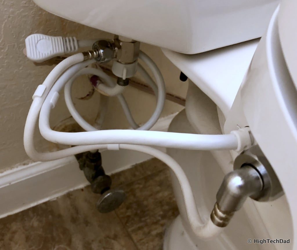 After that, you can attach the other end of the bidet hose to the seat. I actually attached the hose to the seat before putting the seat on the plate. And I connected the bidet hose to the T-valve after that.