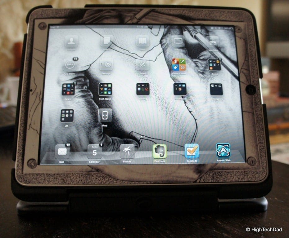 Below you can see the innovative hinge in action. This one one of the nicer ways to view iPad content (e.g., a movie). Other cases I have found to be a bit clumsy at this, but it is quite easy to do with the ClamCase. At the bottom of the review, you can see another photo that shows the ClamCase in the “tablet” mode. Do note how thick it is.