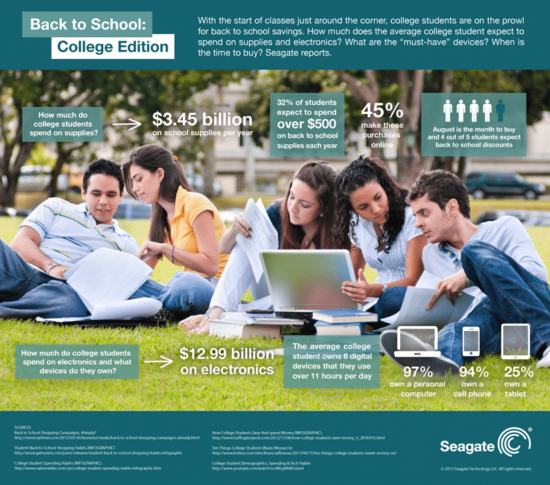 Seagate recently reached out to me to discuss some statistics on college student technology. Obviously this is something near and dear to my heart – technology and family. (Thankfully) my kids are still a few years away from college…not that many actually…and I have been sticking my fingers in my ears and saying “lalalalalalala” when people talk about the expenses of college. In terms of tech expenses, take a look at this Seagate infographic: