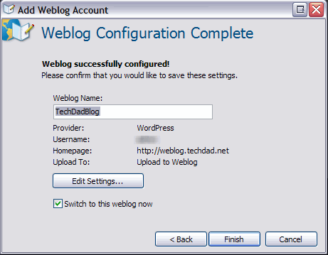 After that, you are requested to enter in your Blog URL and the user name and password that you use to access your blog. Live Writer seems to be smart enough to be able to detect who your provider is.
