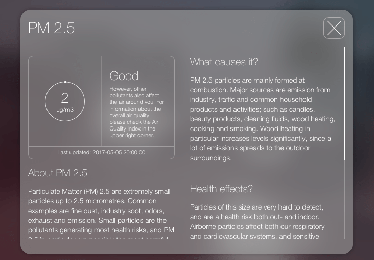 In this enhanced display, you see various items representing pollution or particulate matter floating in front of you. It is interactive so if you press on any of the “+” symbols, you can get more information on that particular item. For example, I clicked on the PM 2.5 item and got the following information: