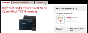 Congratulations to @graywolfpack who, via random selection using TWTaway.com, won the Sony Cyber-shot TX7 with the laser engraved signature from Taylor Swift!