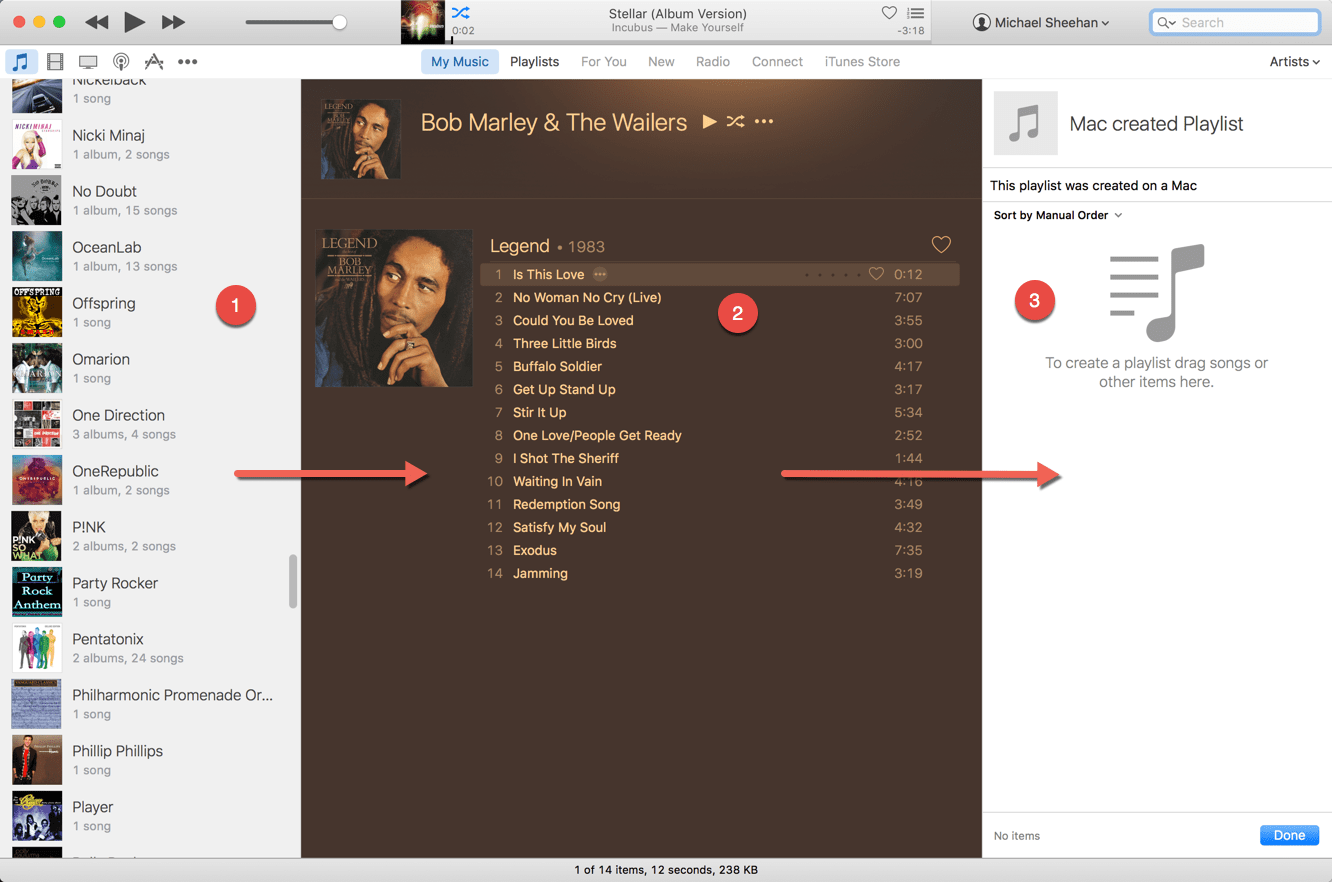 From there, it is a 3-step process to add various songs or albums to you new iTunes playlist. I had my music sorted by Artist. So, starting on the left (#1 below) and I clicked on the Album. Then I selected the song(s) I wanted in the playlist (#2) and dragged the song(s) over to the right into my playlist (#3). That’s it!
